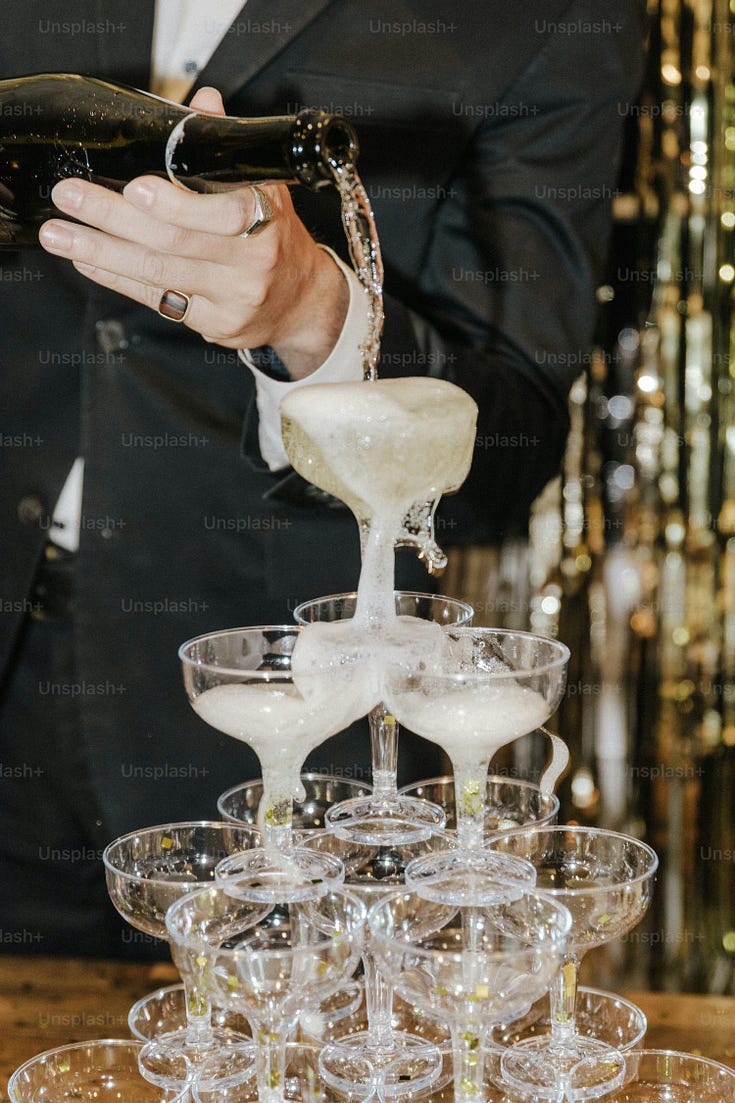 A glass tower is a stunning centerpiece for any event, especially weddings and celebrations. Stack glasses in a pyramid shape and pour champagne for a mesmerizing cascading effect. This elegant display adds sophistication and charm to your event, creating unforgettable memories for you and your guests. A true showstopper for any special occasion.